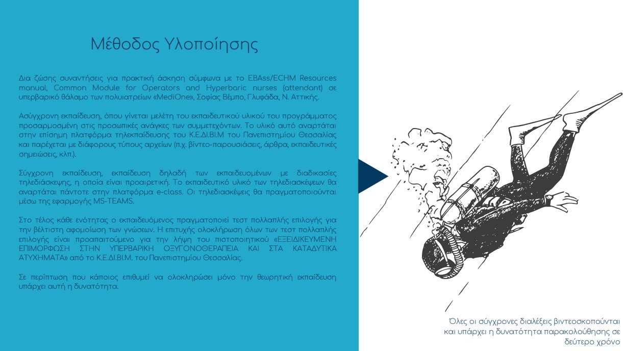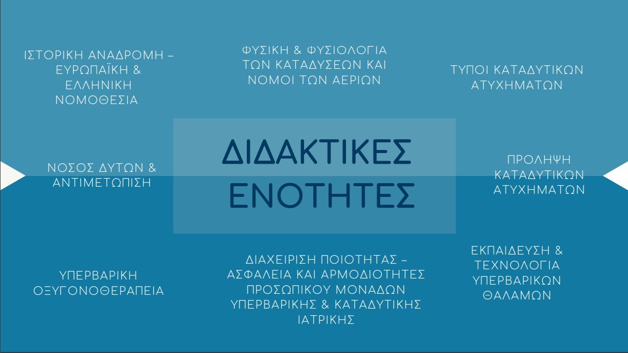Απώτερος στόχος του προγράμματος είναι η αποκόμιση γνώσεων σε θέματα που αφορούν στην οργάνωση, λειτουργία και management των Μονάδων Καταδυτικής Υπερβαρικής Ιατρικής, οι οποίες διαθέτουν Υπερβαρικούς Θαλάμους και ως κύριο αντικείμενο τους έχουν την κλινική εφαρμογή της Υπερβαρικής Οξυγονοθεραπείας και την αντιμετώπιση των Καταδυτικών Ατυχημάτων με ασφάλεια και ποιότητα στους χρήστες των παρεχόμενων υπηρεσιών Υγείας.